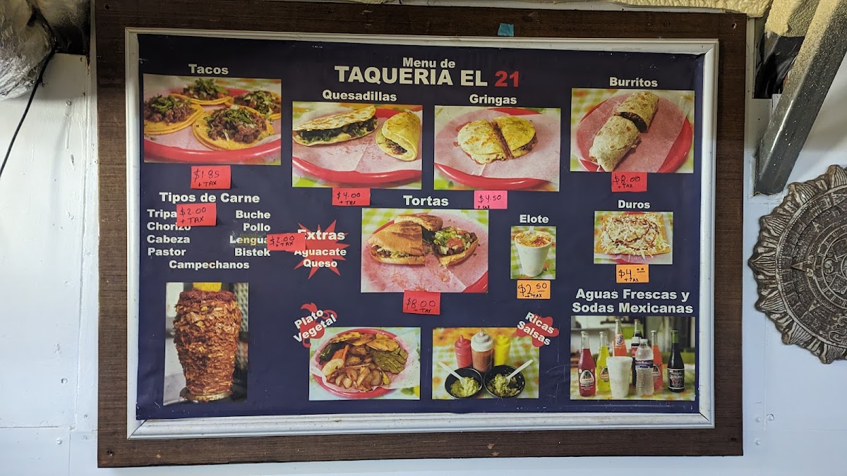 The menu at Taqueria El 21 offers a straightforward and inviting selection of Mexican favorites that feel both familiar and satisfying. It’s the kind of place where casual bites like tacos and quesadillas come together with comforting flavors that invite you to slow down and enjoy the moment.